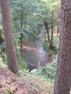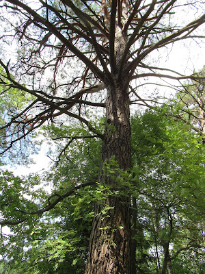 Zaraz za tym pomostem przeleciał nade mną dzięcioł duży i wylądował na naprawdę wysokim drzewie. Zasłaniały go liście i cały czas się ruszał. Ze zdjęć nici L Szliśmy dalej pośród pięknego sosnowego boru. Rzeczą godną uwagi były na pewno drzewa. Były to ogromne sosny, których dwie osoby nie mogły otoczyć: