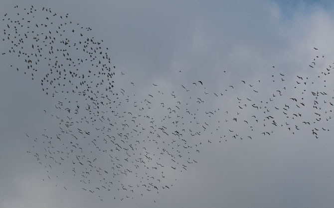 Szpacza wydaje mi się ta zwarta chmara w lewym górnym roku. Reszta to taka gawronia trochę rozciągnięta "autostrada", i ptaki mają w niej mniej szpaczą sylwetkę. Mylę się?
